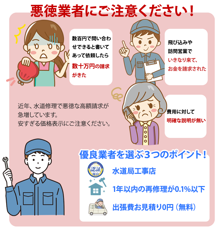 水漏れ修理依頼の中で全体の10%が他社での修理後1年以内の再修理。園多くは「内部部品のチェックミス」備後水道サービスあなたの街の水道屋さんは1年以内の再修理が0.1%以下(実実績)